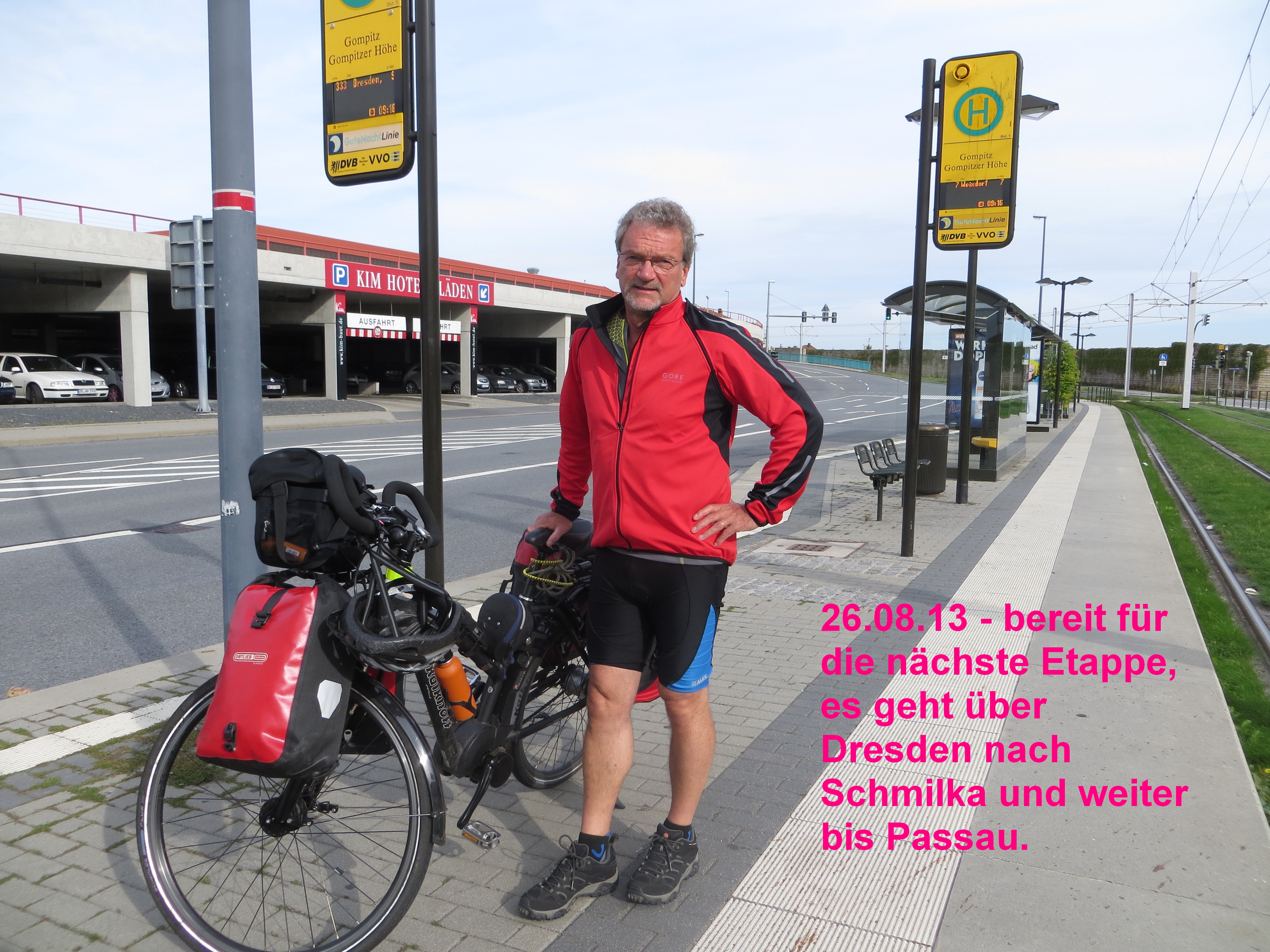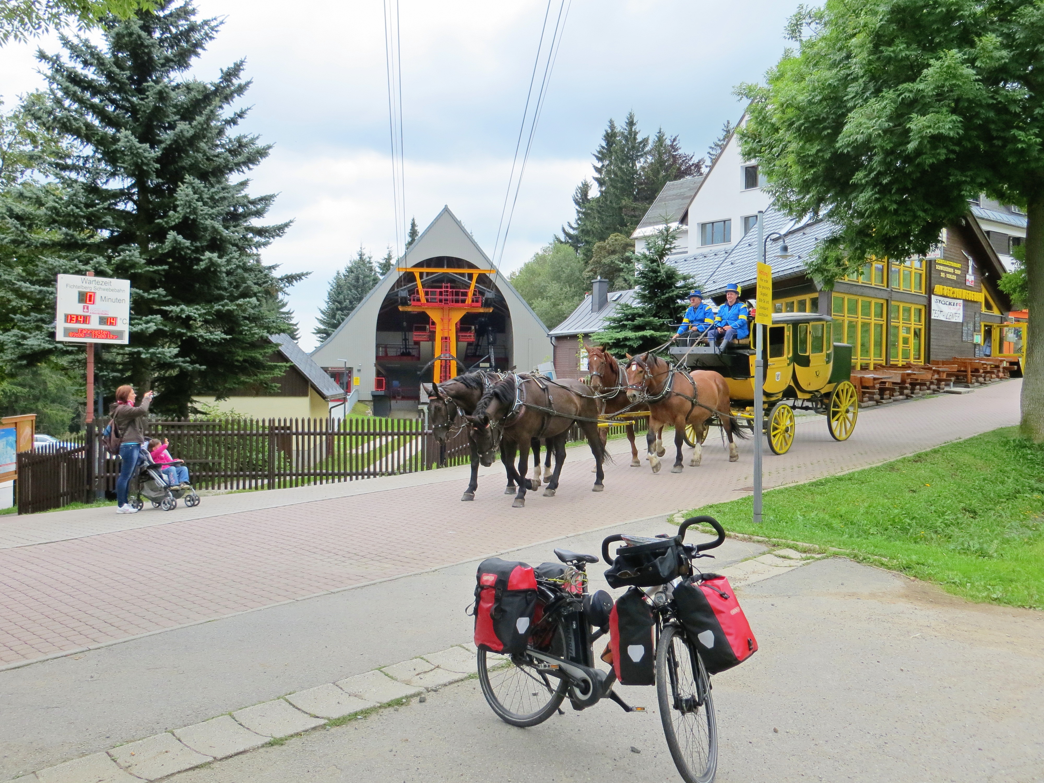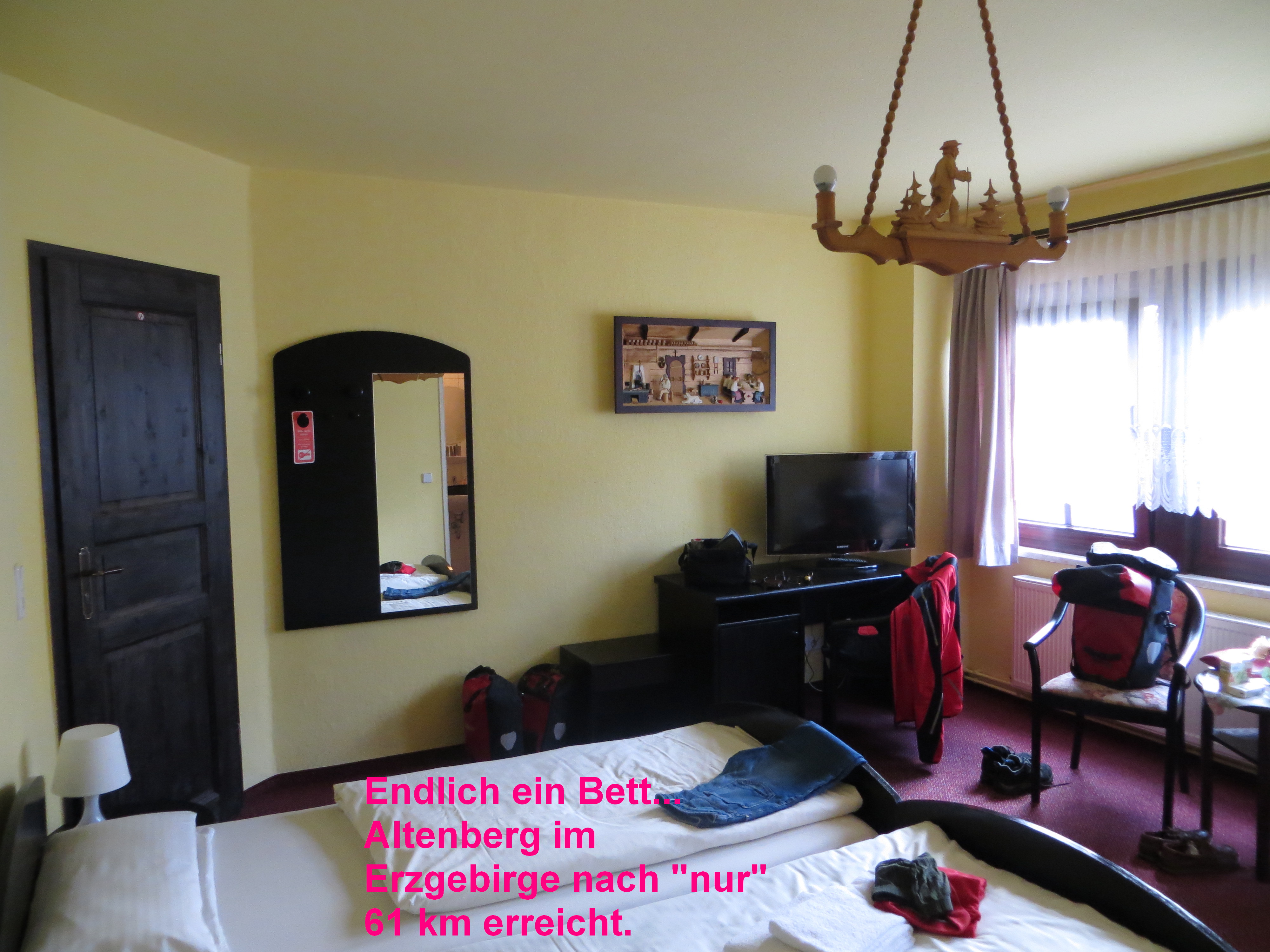 Montag standen wir beide am Hauptbahnhof, meine Frau fuhr zurück nach Hamburg und ich stieg in die S-Bahn nach Bad Schandau. Die letzte Etappe in 2013 lag vor mir. Zuhause hatte ich mir im Routenplaner das Höhenprofil bis Passau angesehen, die entspannten Tage waren vorbei, das stand fest. Schon in Bad Schandau der Beweis, es ging gleich bergauf in die sächsische Schweiz Richtung Altenberg. Das Erzgebirge, mit dem höchsten Berg Sachsens, dem Fichtelberg bei Oberwiesenthal, sollte mich die nächsten Tage richtig beschäftigen. Wenn man so mit 8 km/h die Berge hoch schleicht, werden die Tagesetappen natürlich kürzer, die Pausen dafür um so länger.