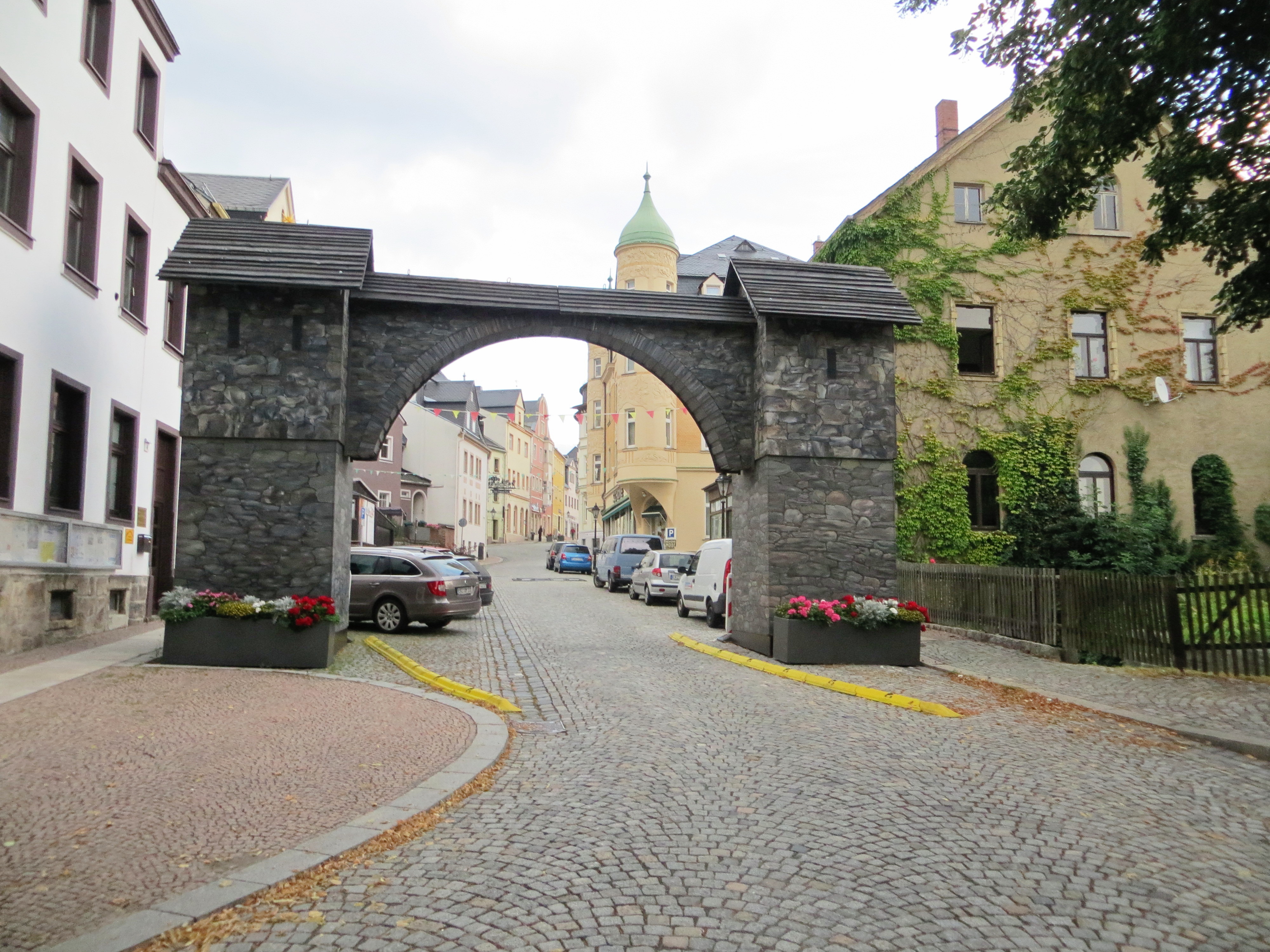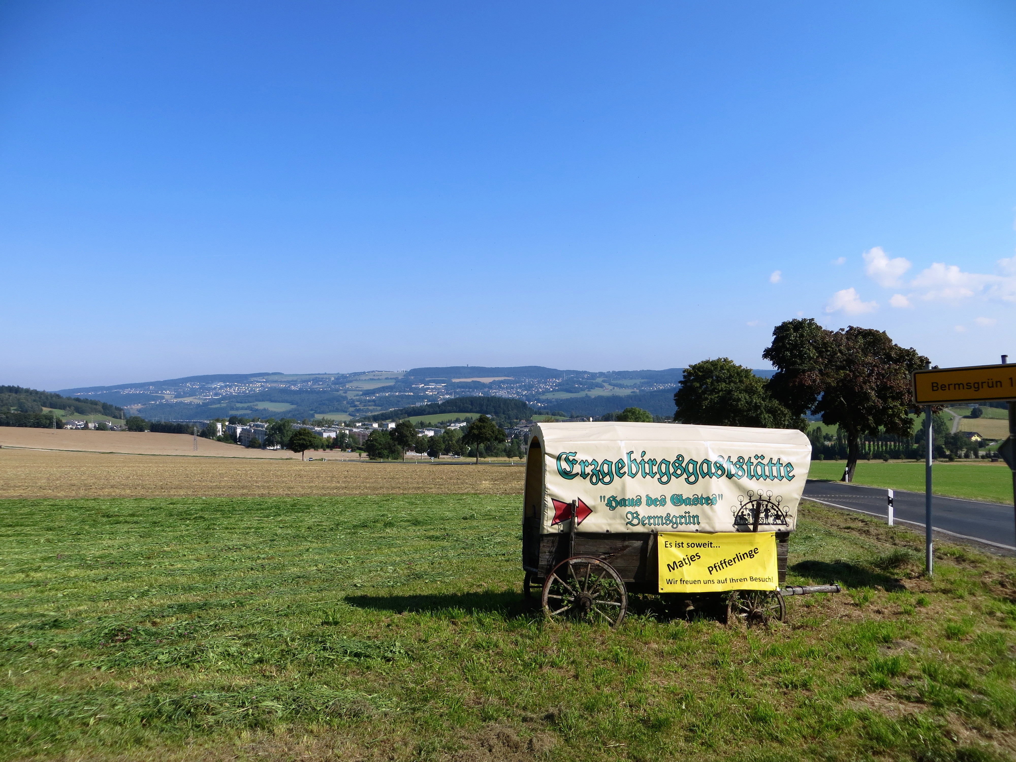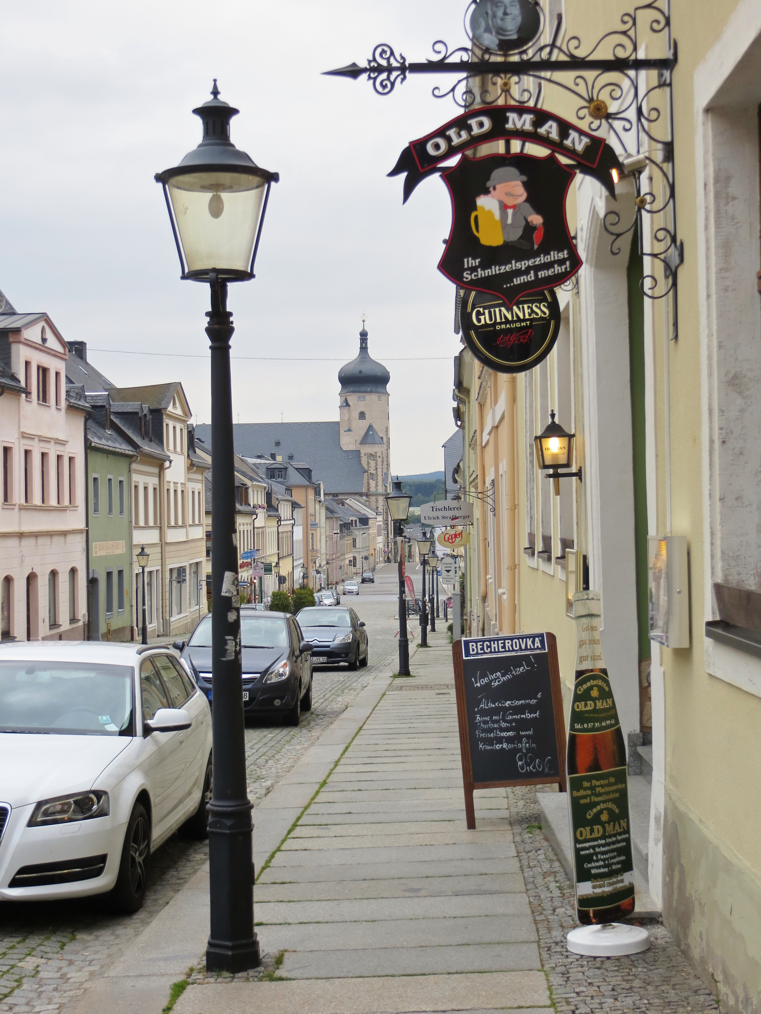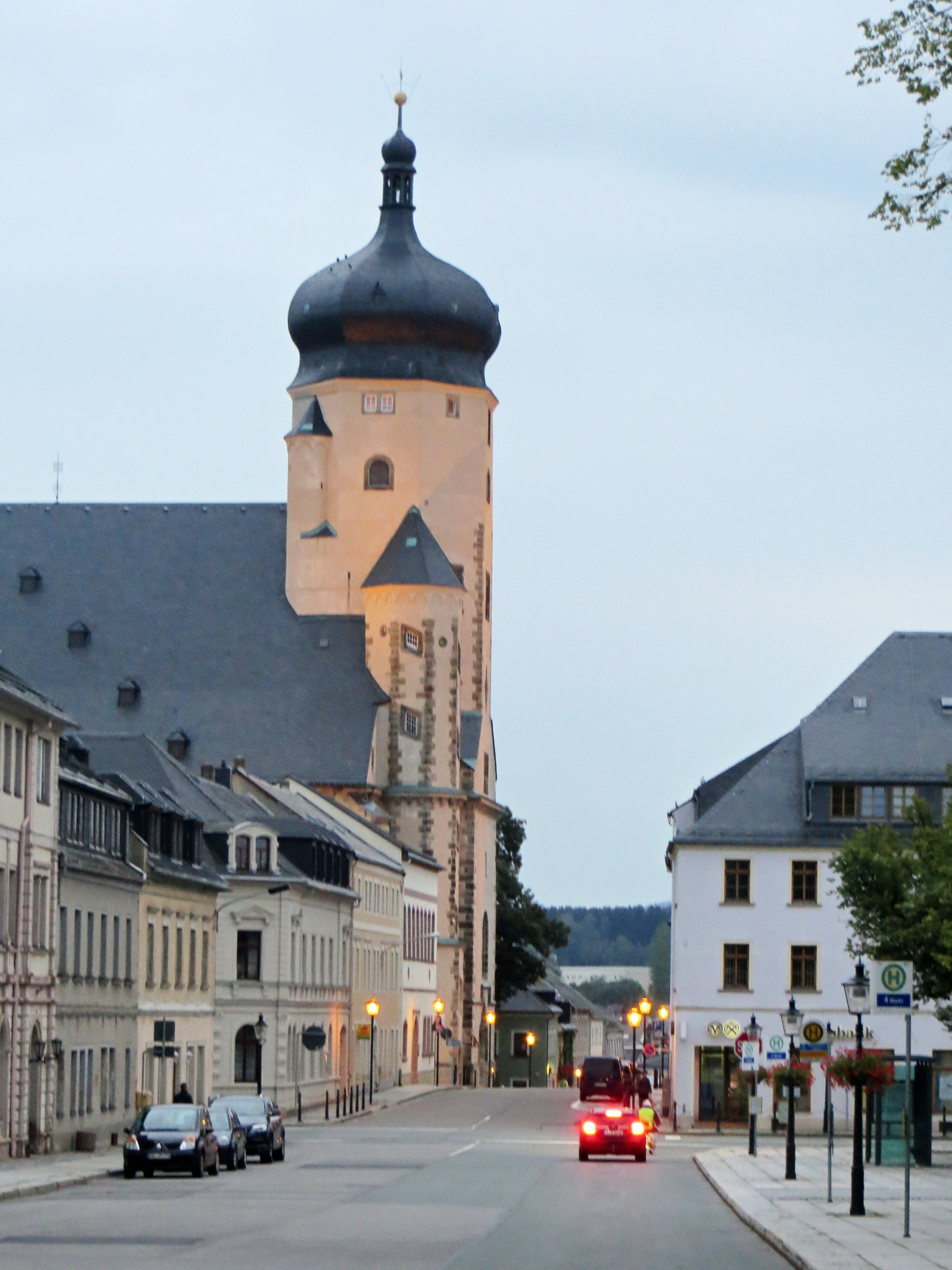 Am dritten Tag hatte ich Oberwiesenthal erreicht. Nach einem „Aufstieg“ zum Fichtelberg (die Passstraße ging bis auf 1.083 m) wurde ich mit einer zweistündigen Abfahrt, fast bis Schwarzenberg, belohnt. Das angepeilte Hotel im Rathaus war leider geschlossen, meine Suche nach einem Zimmer endete im 3. Stock einer privaten Zimmervermietung. Einfach und billig, dafür mit Aussenfahrstuhl für das Gepäck (siehe Fotos). Wenn man müde ist schläft man auch in pink DDR-Frotteebettwäsche gut, oder ? Am nächsten Morgen, nach einem ausgiebigen Frühstück in einem kleinen Café, ging es Richtung Vogtland, eine Region im Grenzgebiet von Sachsen, Bayern und Thüringen. Meine letzte Station in Sachsen war am Abend die kleine Stadt Oelsnitz. Deftiges Essen, leckeres Bier und Unterhaltung von einer schwäbischen Wandergruppe, was will man mehr.