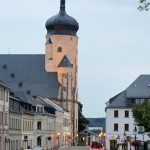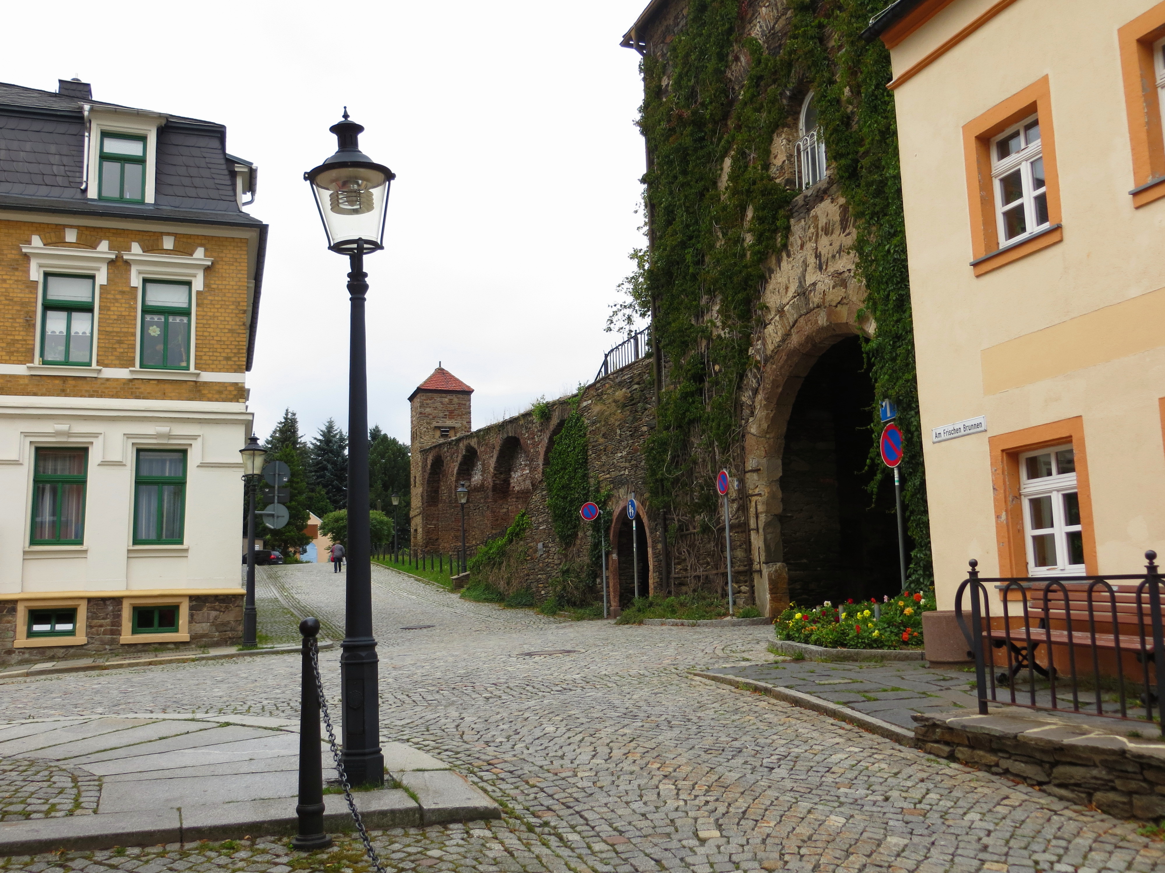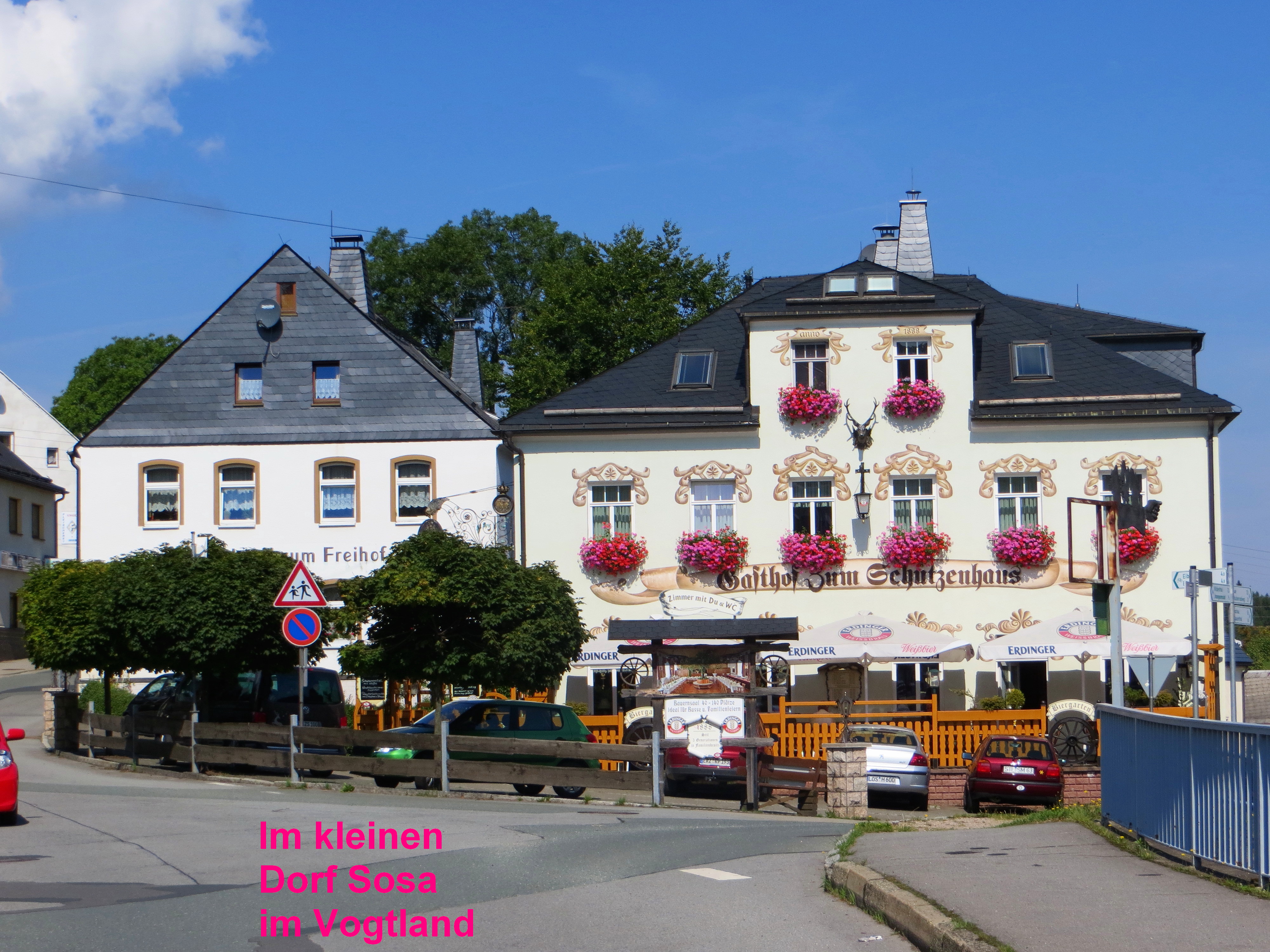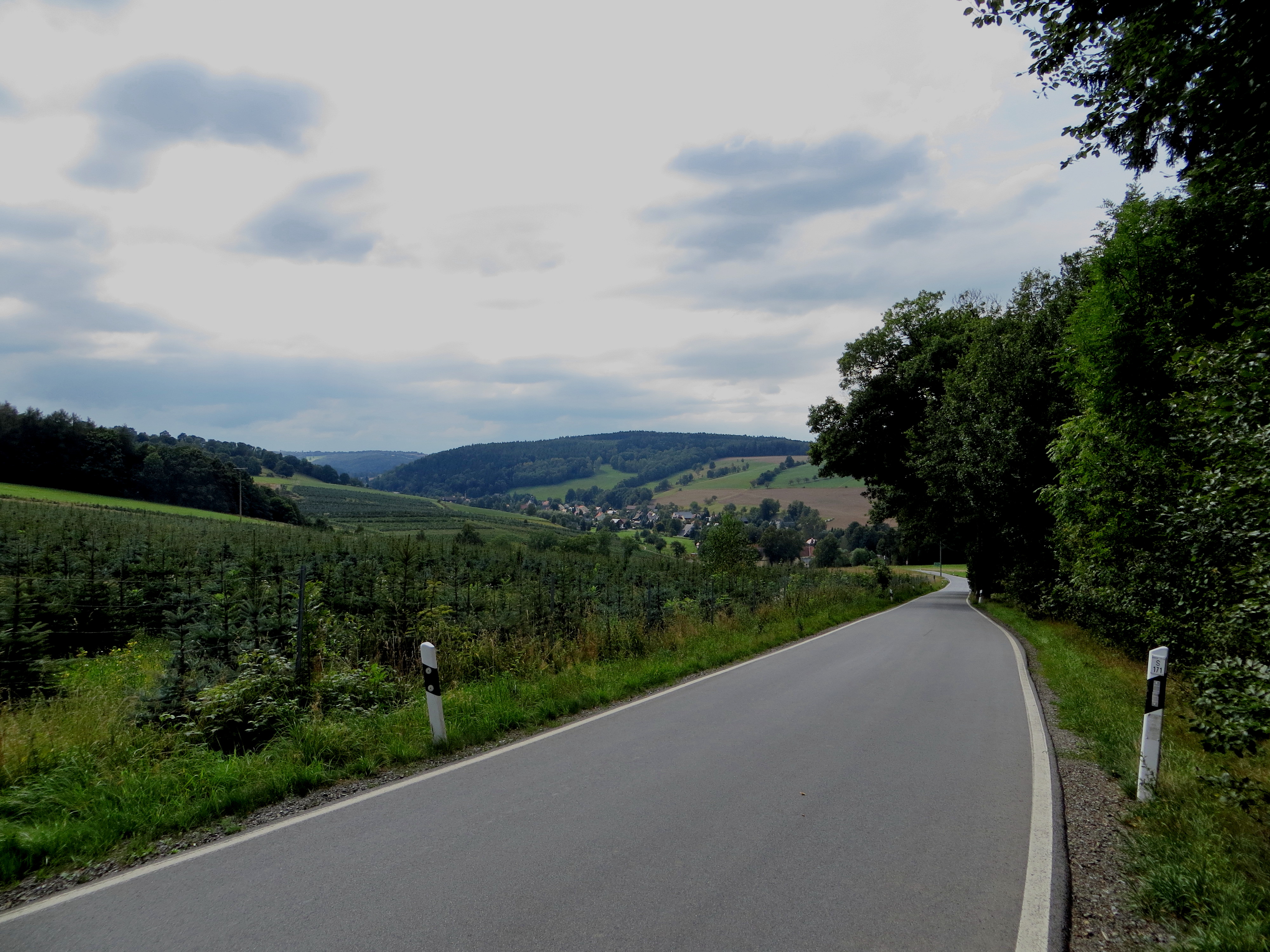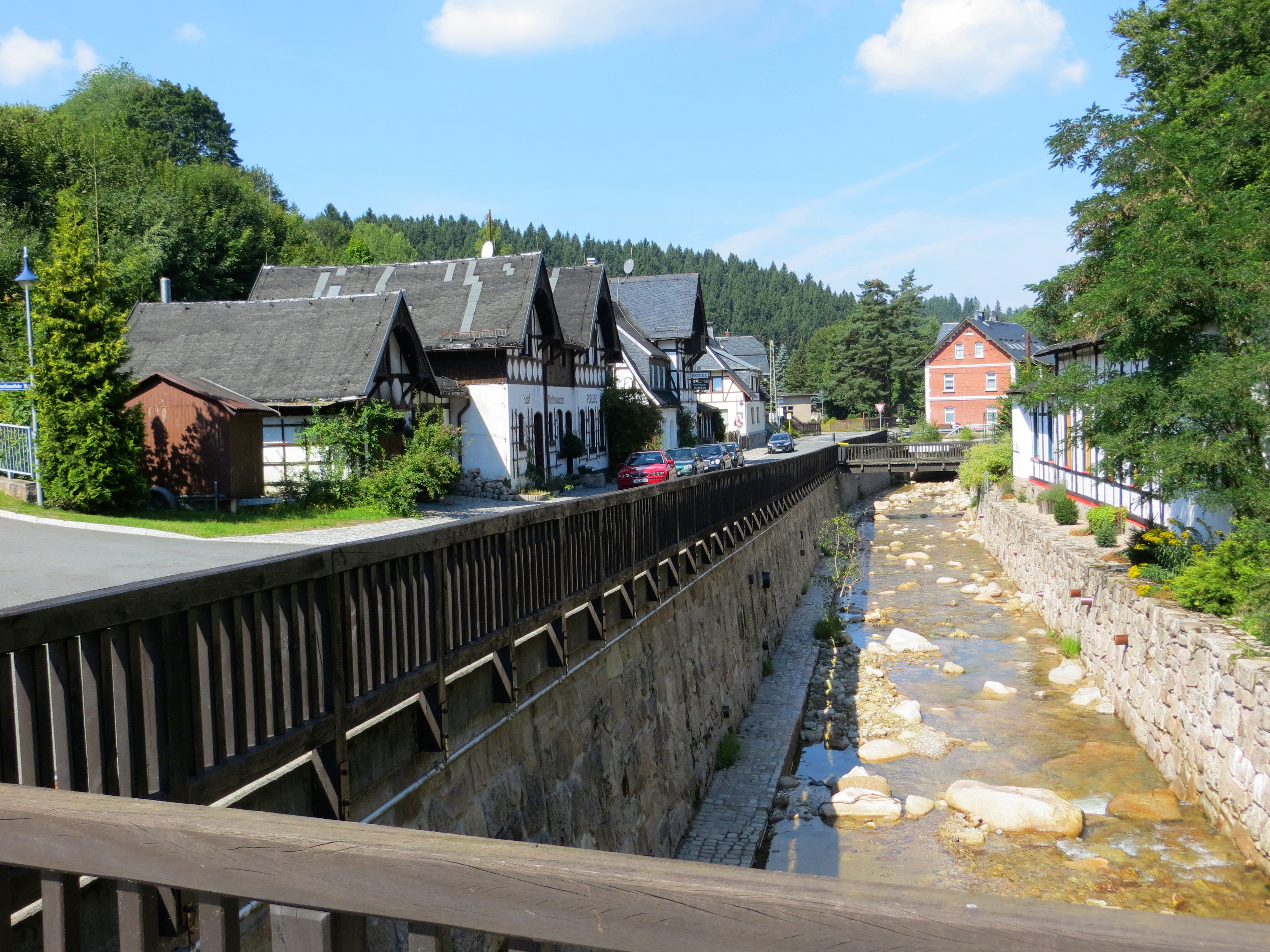 Am dritten Tag hatte ich Oberwiesenthal erreicht. Nach einem „Aufstieg“ zum Fichtelberg (die Passstraße ging bis auf 1.083 m) wurde ich mit einer zweistündigen Abfahrt, fast bis Schwarzenberg, belohnt. Das angepeilte Hotel im Rathaus war leider geschlossen, meine Suche nach einem Zimmer endete im 3. Stock einer privaten Zimmervermietung. Einfach und billig, dafür mit Aussenfahrstuhl für das Gepäck (siehe Fotos). Wenn man müde ist schläft man auch in pink DDR-Frotteebettwäsche gut, oder ? Am nächsten Morgen, nach einem ausgiebigen Frühstück in einem kleinen Café, ging es Richtung Vogtland, eine Region im Grenzgebiet von Sachsen, Bayern und Thüringen. Meine letzte Station in Sachsen war am Abend die kleine Stadt Oelsnitz. Deftiges Essen, leckeres Bier und Unterhaltung von einer schwäbischen Wandergruppe, was will man mehr.