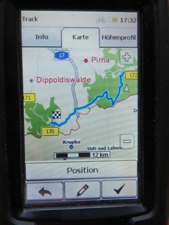 Dank eines Routenplaners konnte ich die Tagesstrecken am PC voraus planen und die GPX Dateien auf mein outdoor Navi (Falk Lux 30) übertragen. Kleinere Probefahrten mit Navi am Lenker verliefen einwandfrei.  Ich entschied mich, meine Karten zuhause zu lassen. Wie sich schnell herausstellte, war das eine Fehlentscheidung.